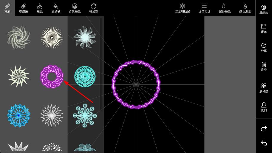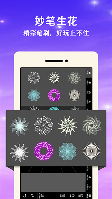 2、丰富笔刷模板:提供多样笔刷模板,借助模板力量,一笔就能生成各种对称图案,省去繁琐绘制步骤,让创作过程更高效,快速呈现理想图案雏形。