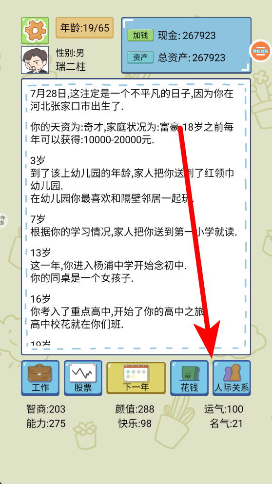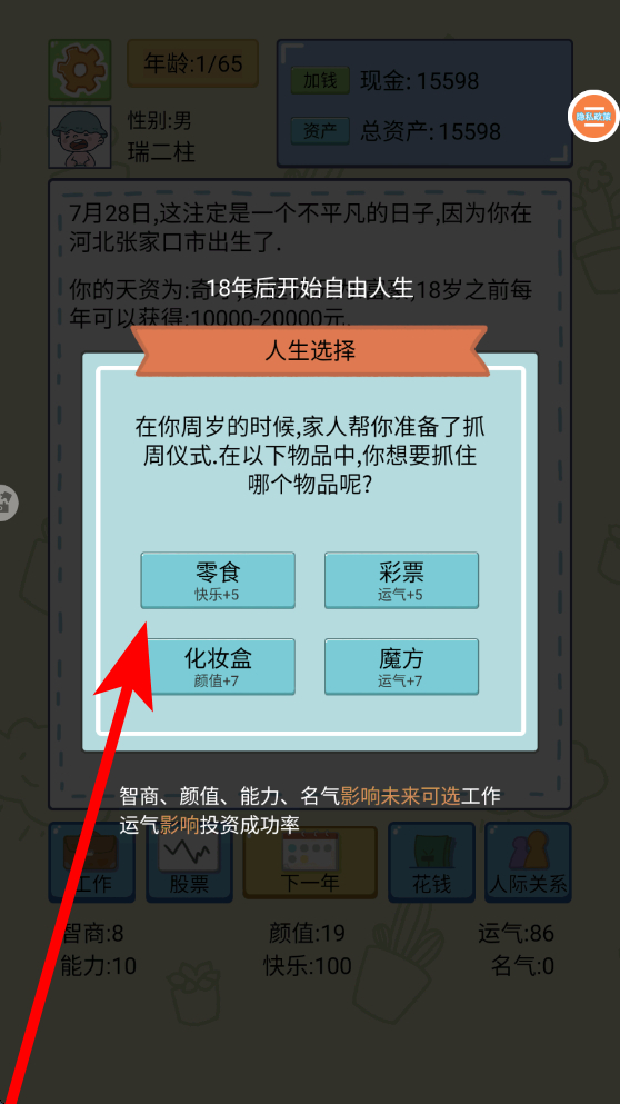 2、在人生的不同阶段,会出现诸如抓周等选择场景,不同选择会带来不同属性加成,比如选择零食能增加快乐,需根据自己的规划做出选择。