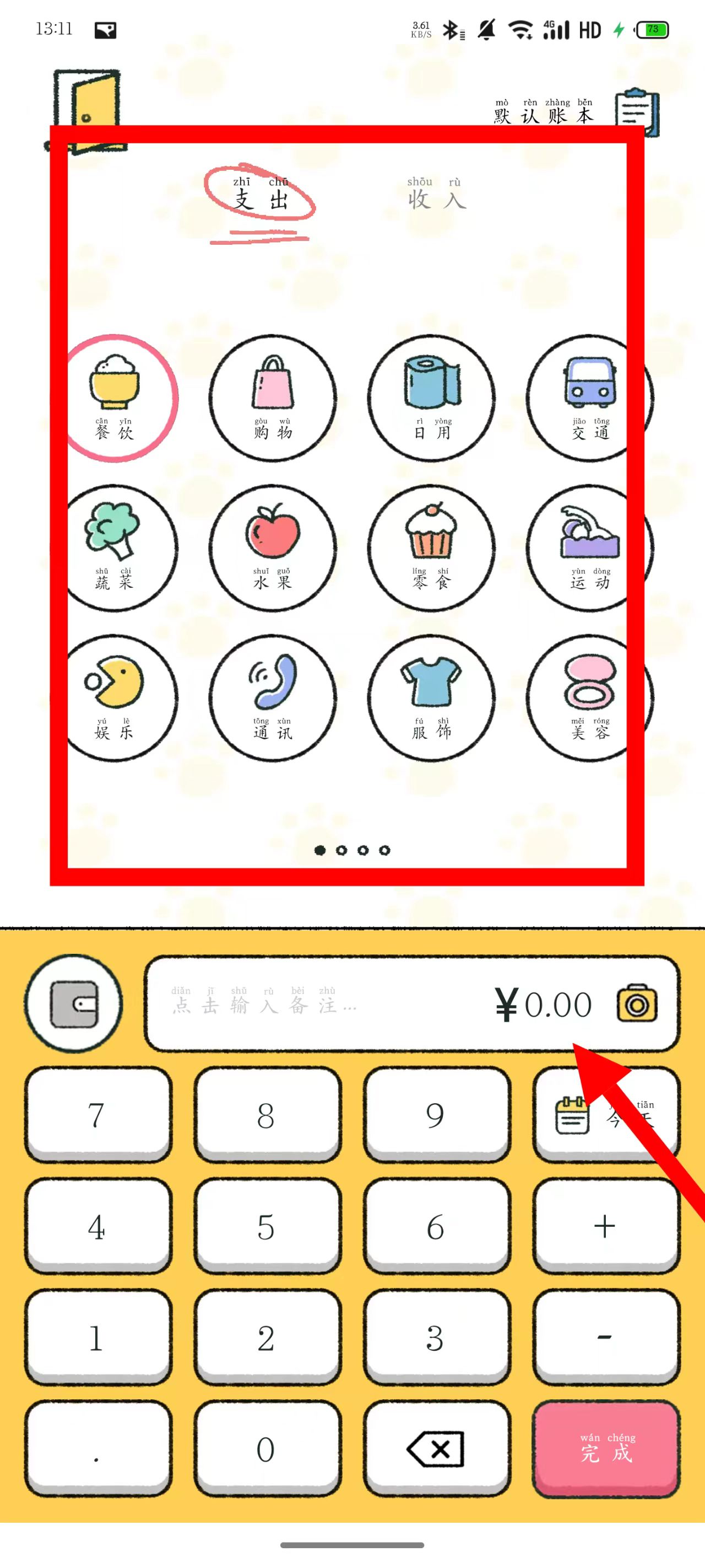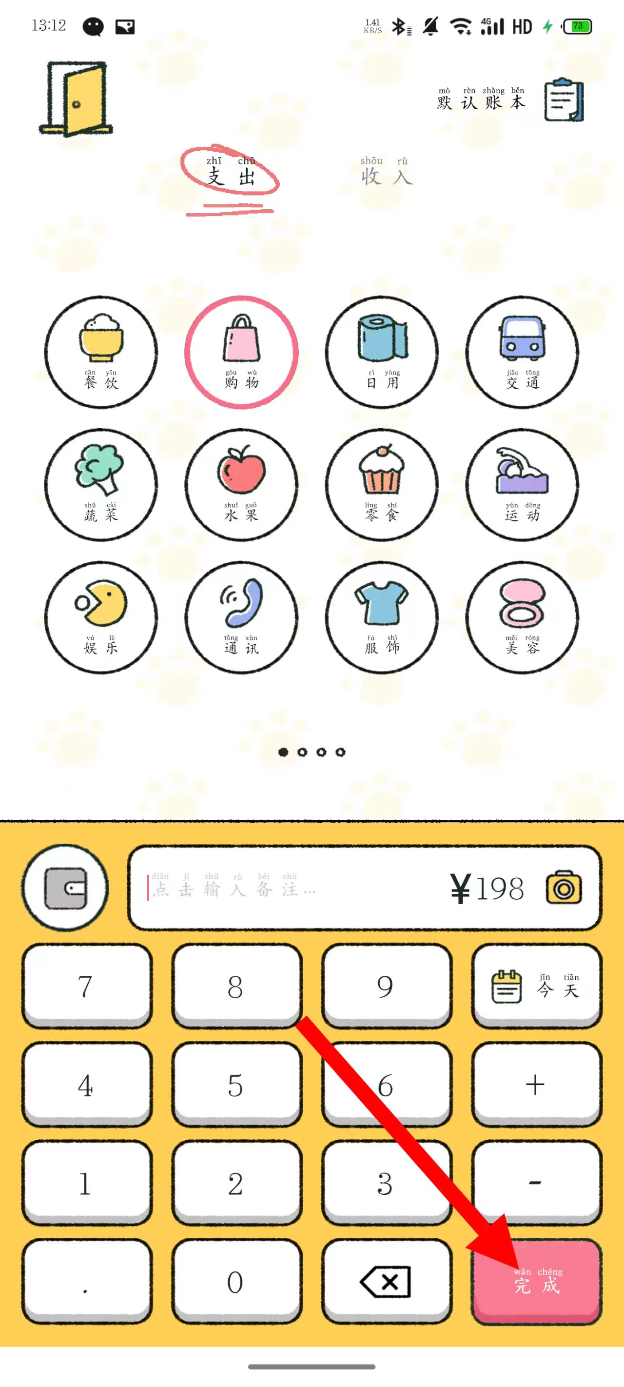 3、输入支出金额,点击完成按钮,完成购物支出的记录。