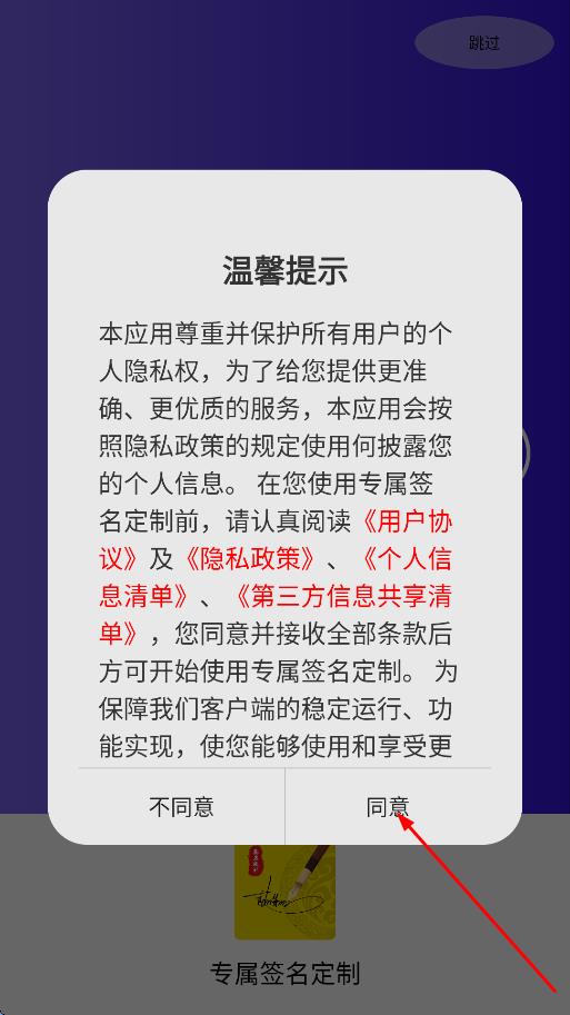 1、在温馨提示弹窗中,点击同意,进入专属签名定制页面。