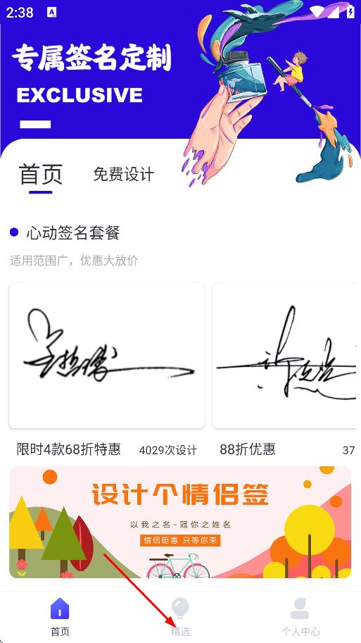 2、在专属签名定制页面,点击底部精选,进入精选签名页面。