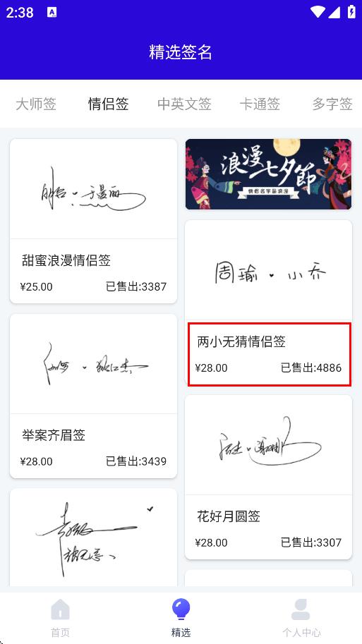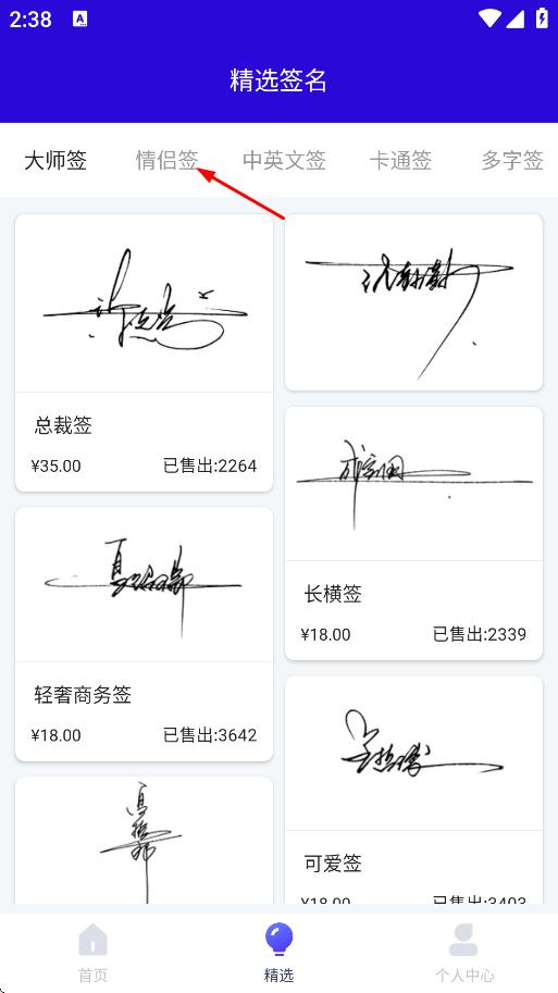 3、随后在精选签名页面,点击情侣签,查看情侣签名样式。