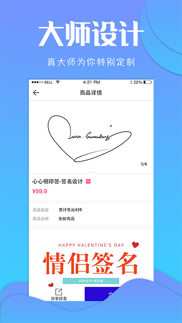 专属签名定制是一款专注于为用户打造专属签名的手机应用,坚信不同签名会带来不同感受,因此在字体特色上倾注心力,涵盖一笔签名、连笔签名、商务签名、行楷签名等多种艺术签名,且不少签名由大师亲自操刀制作,满足用户打造个性签名的需求。