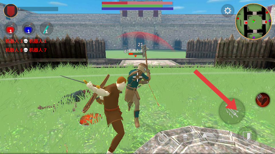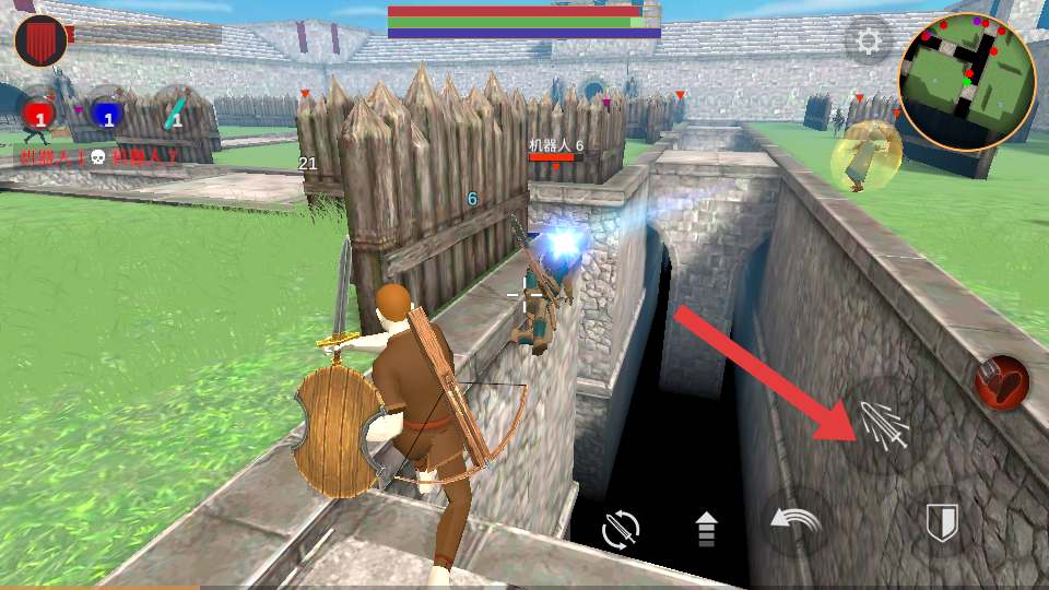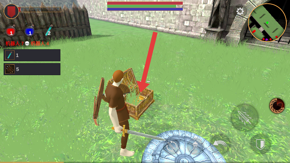 2、战斗中的操作与武器切换:战斗时通过左侧按键控制角色方向,右侧按键实现攻击与武器切换;当敌人距离较远时,点击箭头切换弩弓进行攻击。