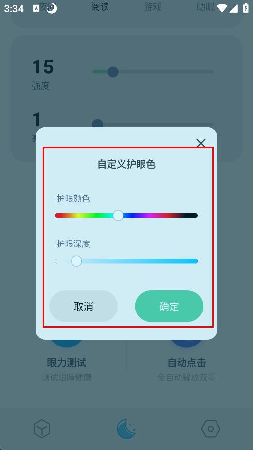 4、在自定义护眼色弹窗中,调节护眼颜色和护眼深度,点击确定。