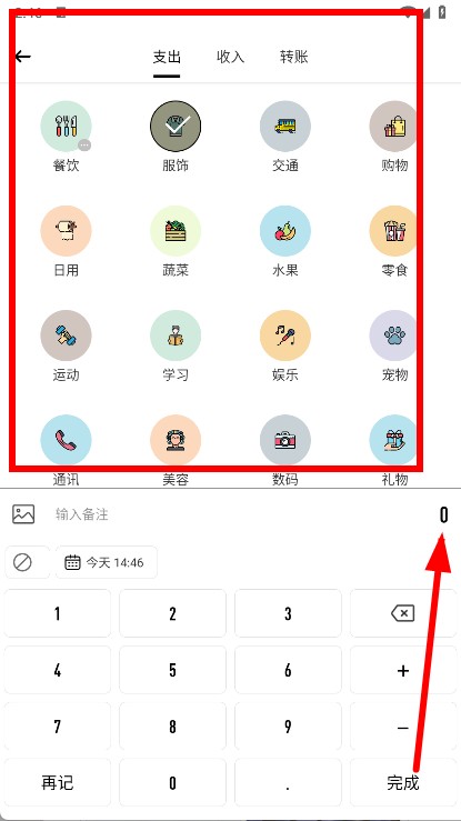 2、在收支分类选择页面,选择支出类别,然后输入支出金额。