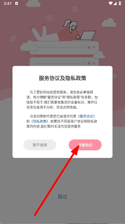 1、打开APP,在提示框中,点击同意协议按钮。