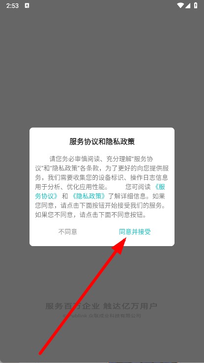 1、打开APP,在弹出的提示框中,点击同意并接受按钮。