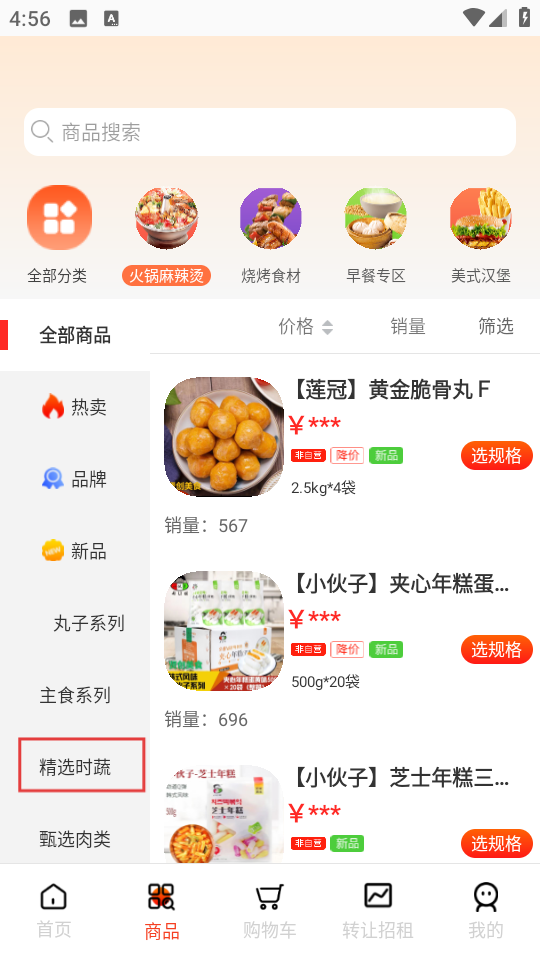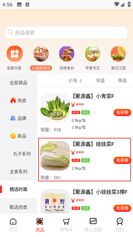 2、在火锅麻辣烫分类页面,点击左侧的精选时蔬选项,进入精选时蔬商品列表页。