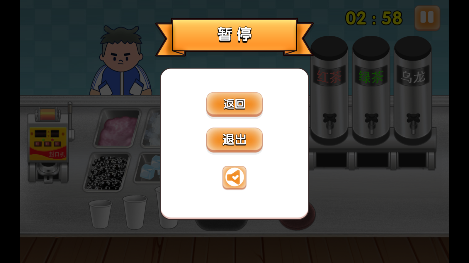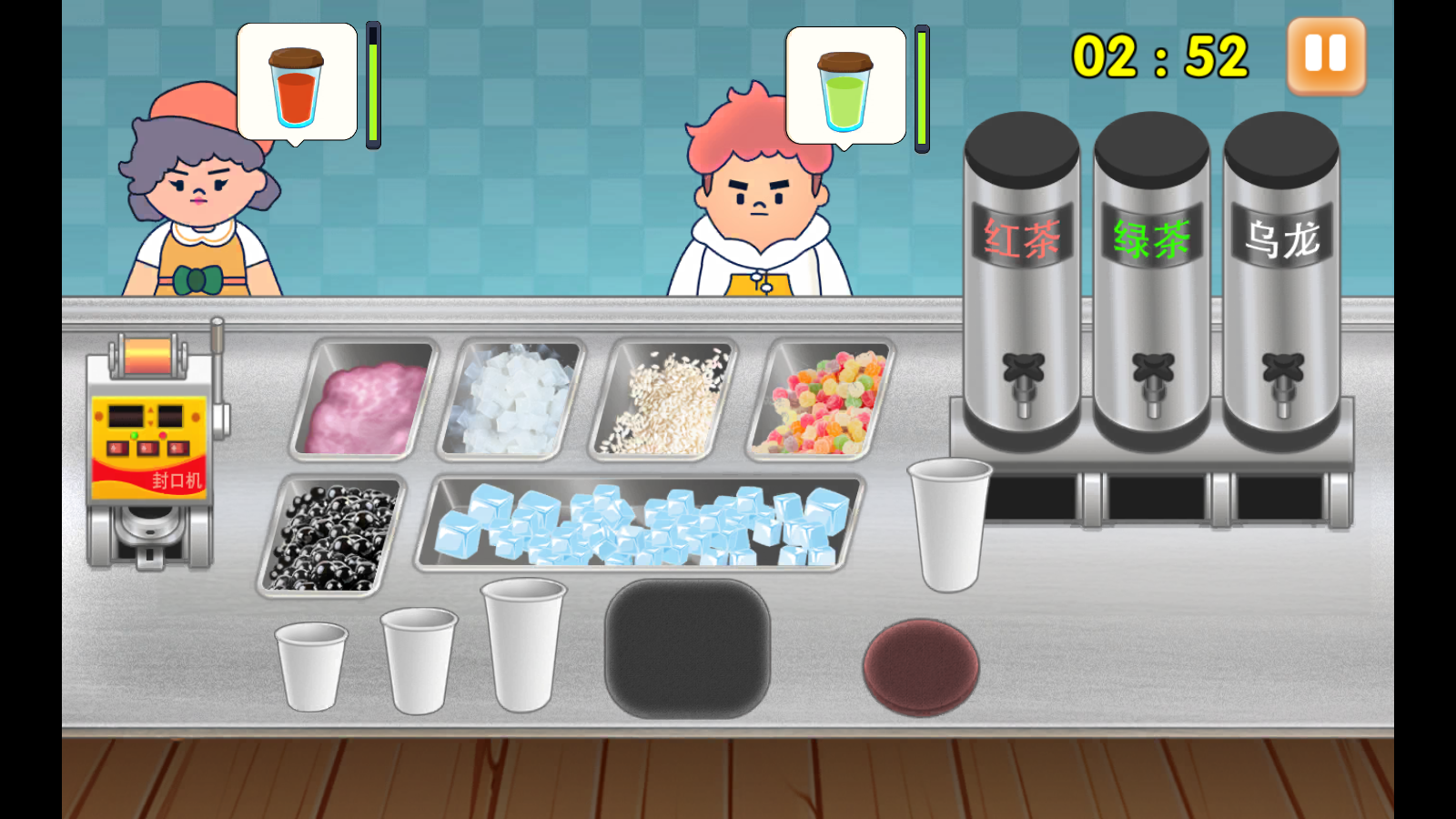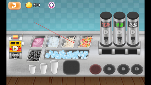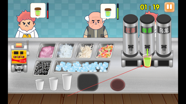 3、添加完配料后,将做好的奶茶放置在封口机上,完成奶茶制作,满足顾客需求获取金币收入。