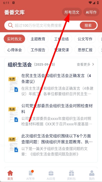 1、打开APP,点击页面上方的所有范文选项,进入范文目录页面。