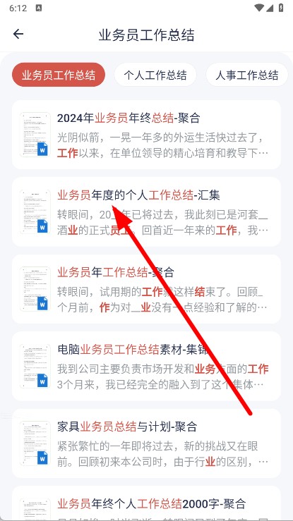 3、在范文列表页面,挑选具体的范文,点击进入范文详情页面。