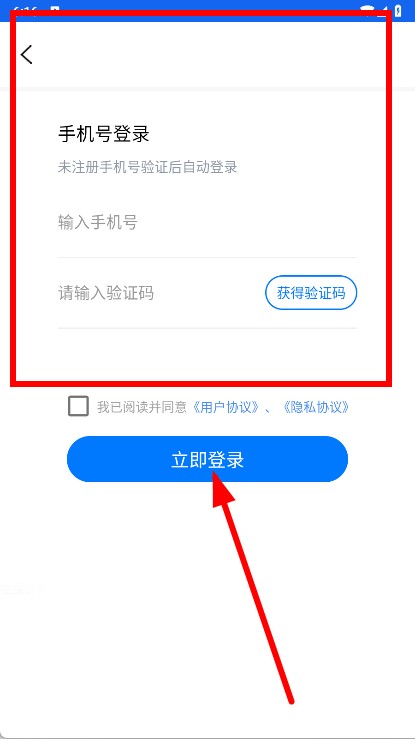 4、输入手机号,勾选同意相关协议后,点击立即登录按钮,完成登录操作。