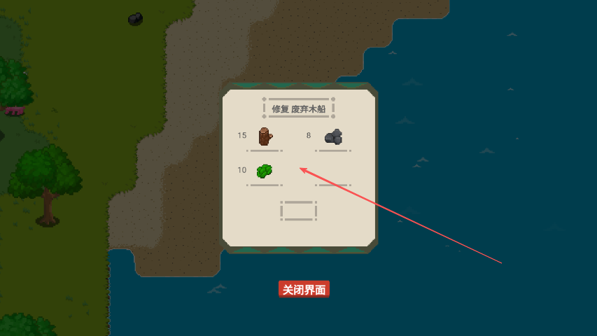 1、看到修复废弃木船提示,收集所需的15份木材、8份石头和10份植物等材料。