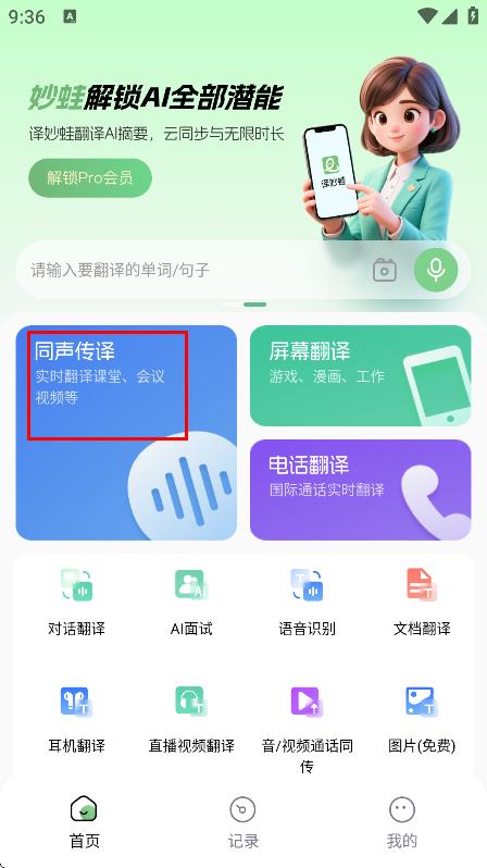 1、在译妙蛙翻译官首页,点击同声传译,进入同声传译页面。