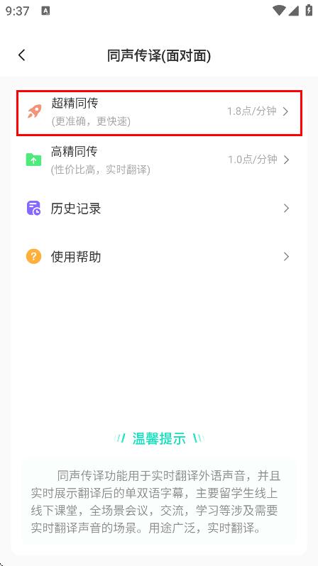 2、在同声传译页面,选择超精同传,进入同传设置相关页面。