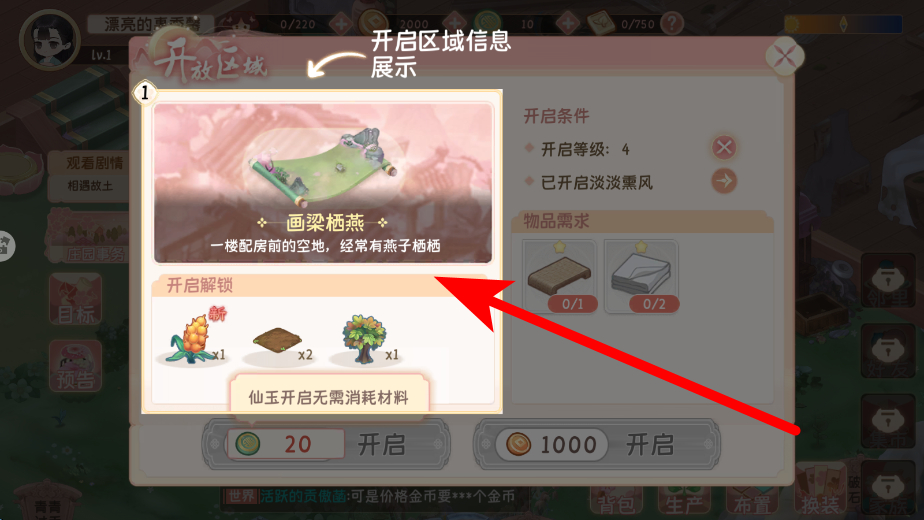 4、开启区域时,会展示详细的信息,包括开启等级、物品需求等,如画梁栖燕区域开启等级为4级,还需特定物品,了解信息后针对性地准备,顺利开启新区域。