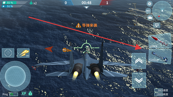 4、进入战斗界面留意屏幕上方提示,如导弹来袭则利用虚拟摇杆和攻击按钮操控飞机躲避并反击。