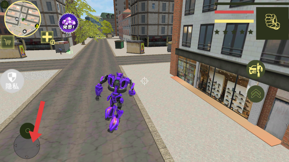 1、点击左下角的方向操控按钮,可控制紫色机器人在城市街道中移动,灵活调整行进方向,探索不同区域。