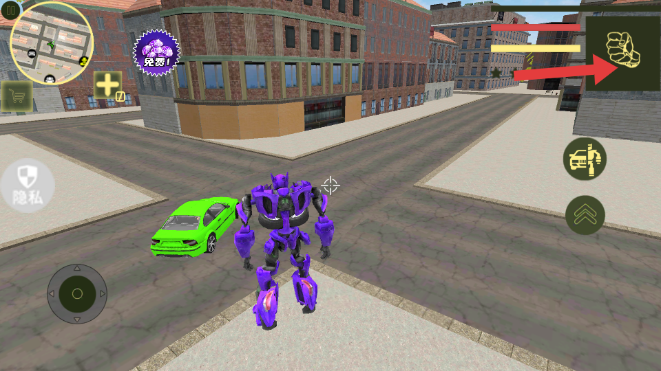2、点击右侧的拳头图标,紫色机器人能对周围物体如绿色汽车发起攻击,用于应对敌人或破坏障碍物。