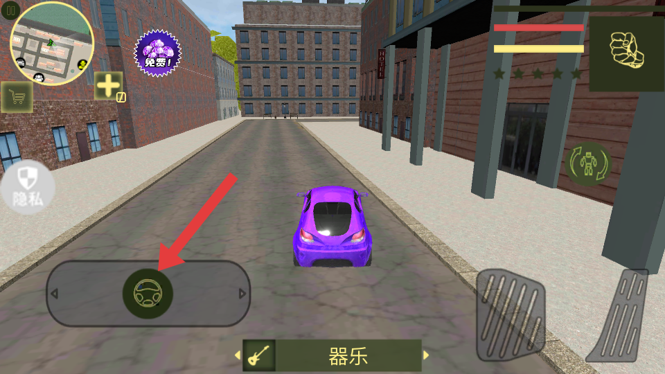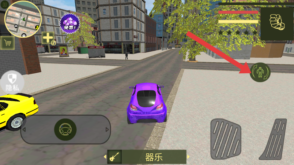 4、在汽车形态下,操作左侧的方向盘按钮,能控制紫色汽车的行驶方向,在城市道路中平稳驾驶。