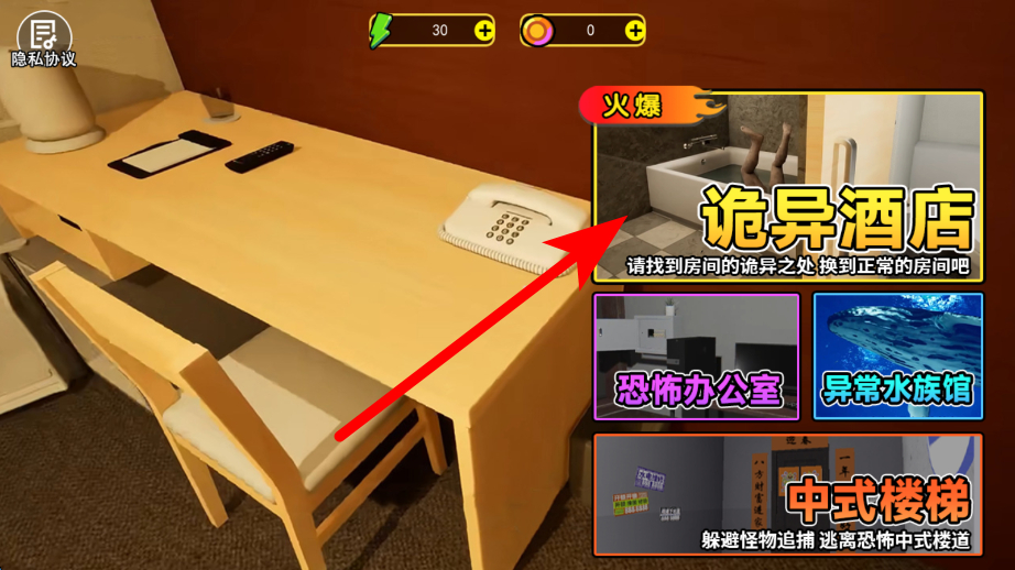 2、选择模式需在界面中挑选合适的模式,比如诡异酒店等模式,不同模式有着不同的场景与任务,开启对应的探索体验。