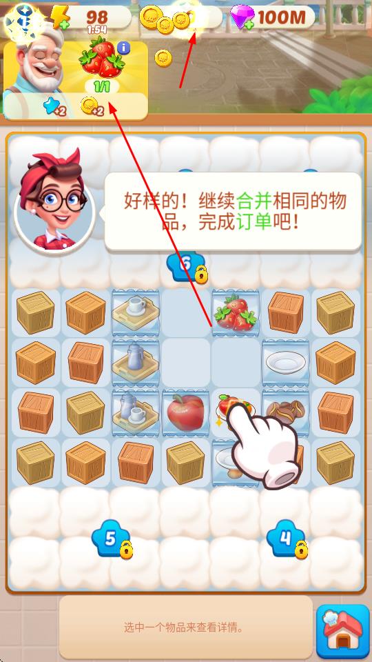 2、持续合并相同物品,完成订单需求,过程中可获取金币等奖励,积累资源助力游戏进程。