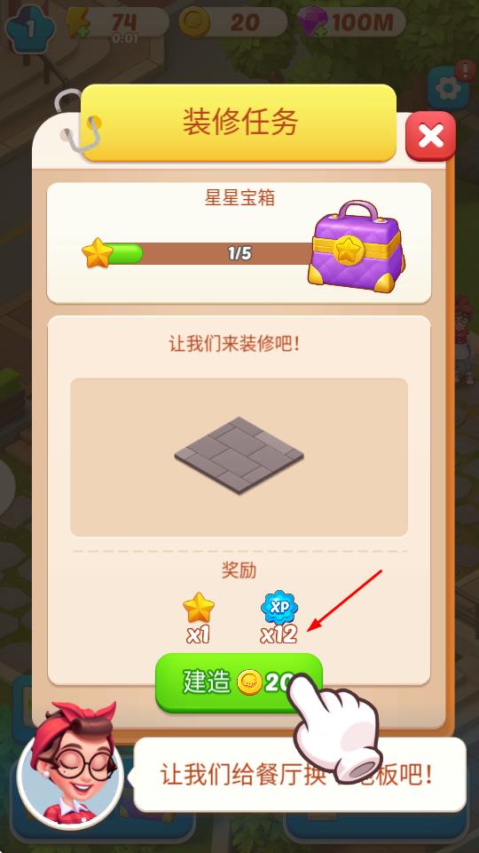 4、参与装修任务,消耗金币进行建造,完成后能获取星星、经验等奖励,同时推进餐厅装修进度。