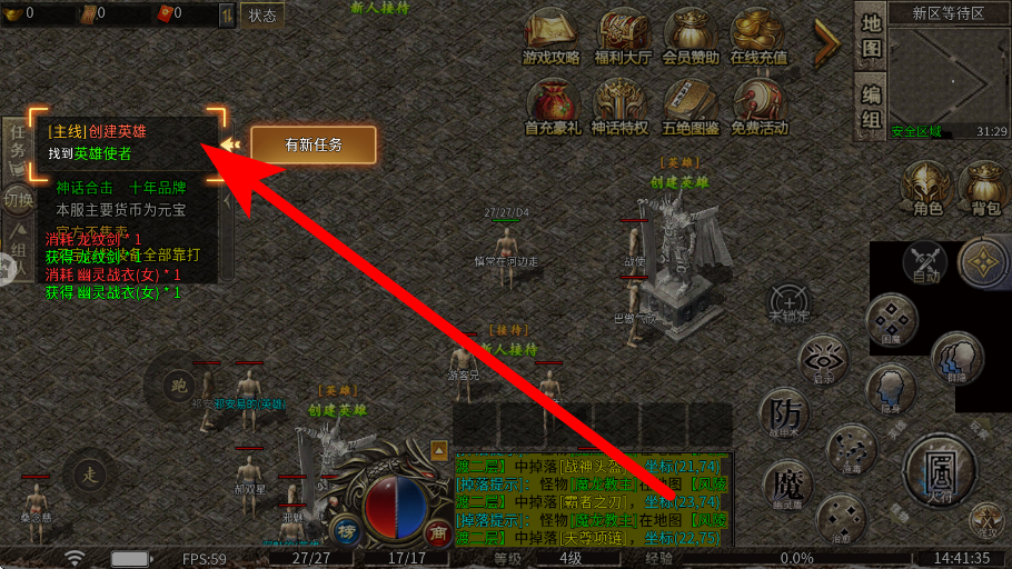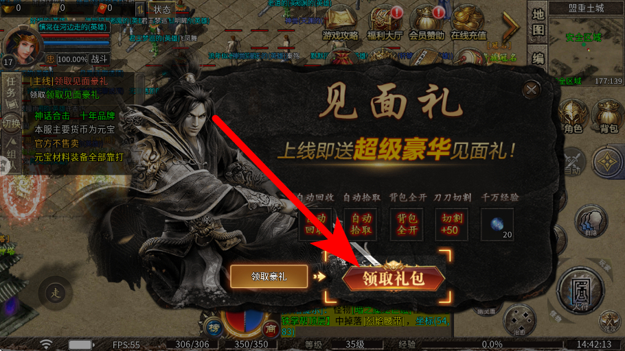 3、领取福利要在游戏中出现福利领取提示时,如见面礼等,点击领取礼包,获取上线即送的超级豪华见面礼,为后续的游玩提供助力。