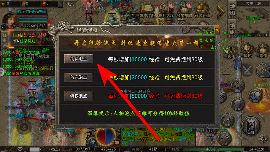 4、泡点升级时,在经验泡点界面,选择合适的泡点方式,如免费泡点,通过泡点来获取经验,提升角色的等级,加快角色的成长速度活动。