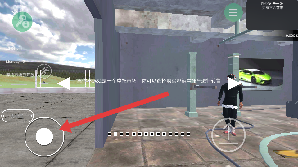 1、在场景中,操控箭头指向的左侧移动摇杆,可控制角色在场景内移动,通过调整摇杆方向,前往摩托市场等目标地点,角色移动基础操作。