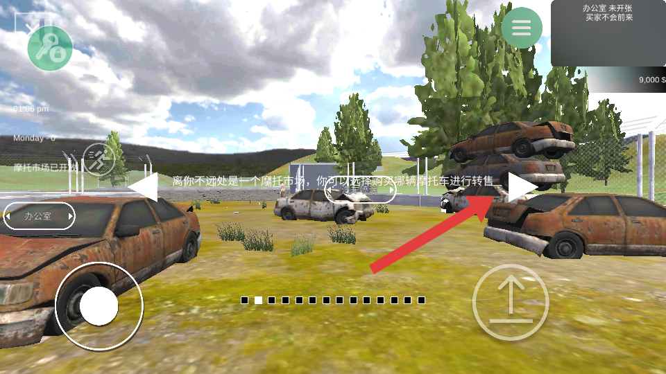 1、开局与基础操作:点击开始标识进入游戏,通过左侧摇杆控制角色移动,箭头按钮实现跳跃,指定红框标志切换视角,熟悉操作后开启经销商生涯。