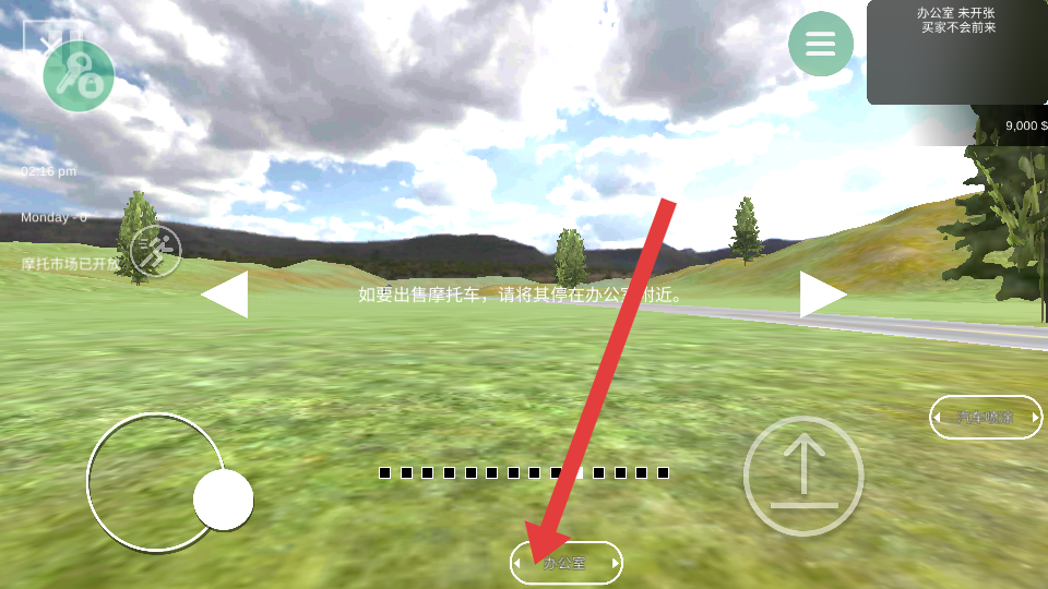 3、当要出售摩托车时,驾驶摩托车朝着箭头指向的办公室标识方向行驶,将摩托车停在办公室附近,满足出售摩托车的位置要求。