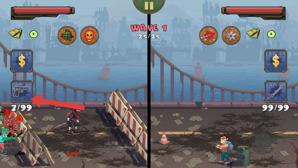 1、战斗开始时,点击箭头指向的手枪图标,切换或装备手枪武器,利用手枪进行远程攻击,打击远处的僵尸敌人,开局创造优势。