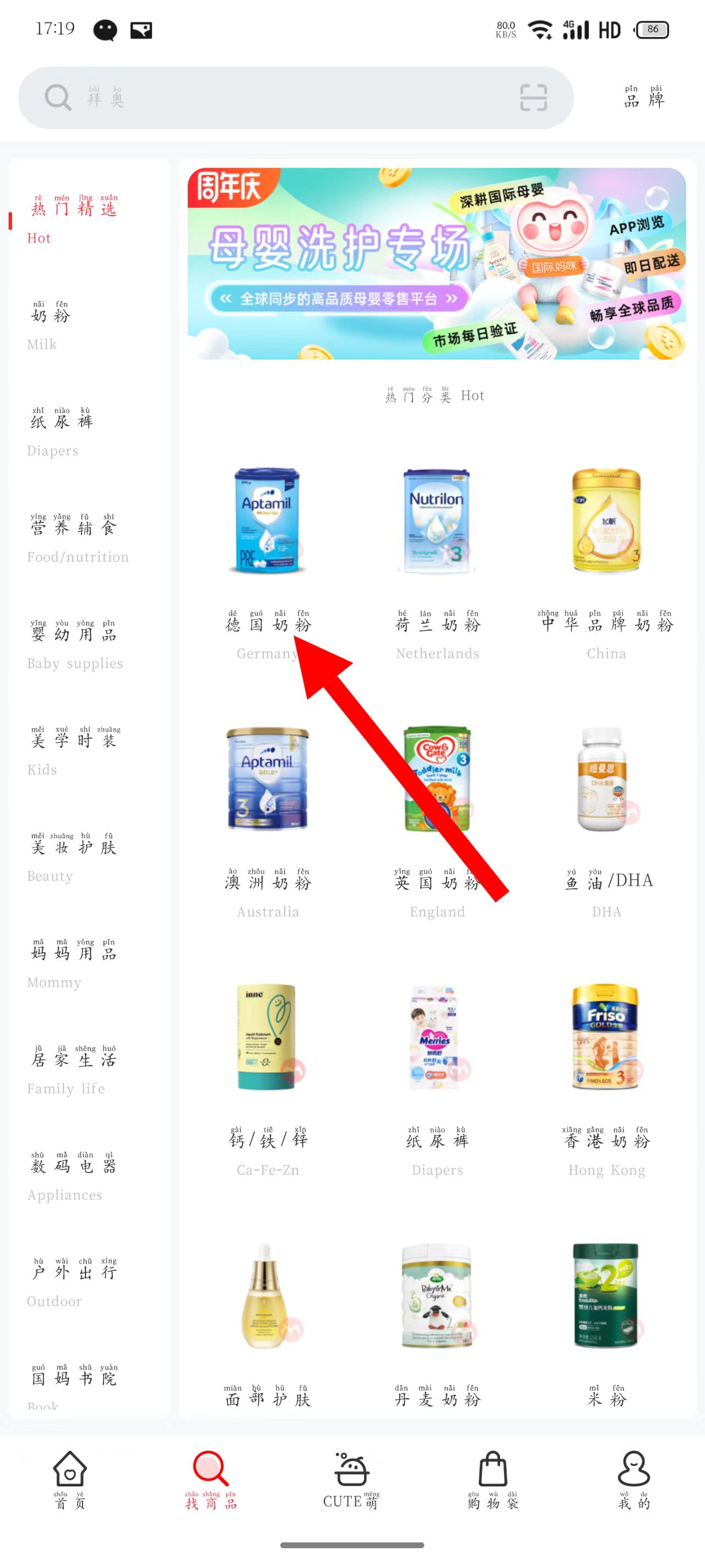 2、在商品查找页面,点击德国奶粉分类,进入德国奶粉列表页。