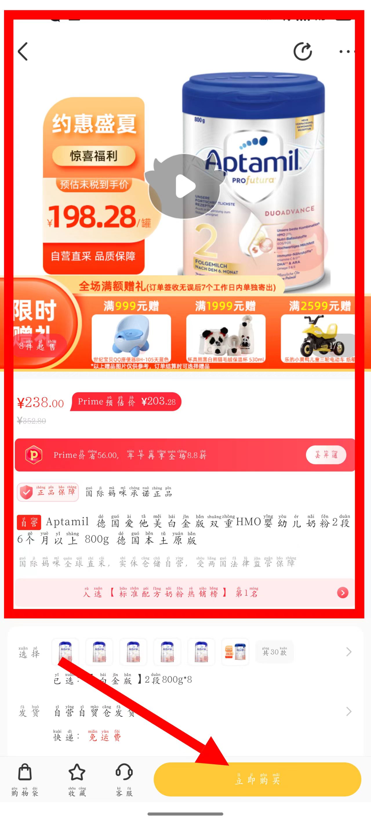 4、在商品详情页,点击底部立即购买按钮,即可购买该奶粉。