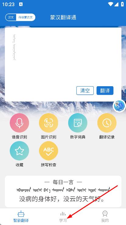 1、打开蒙汉翻译通,点击底部学习,进入学习页面。