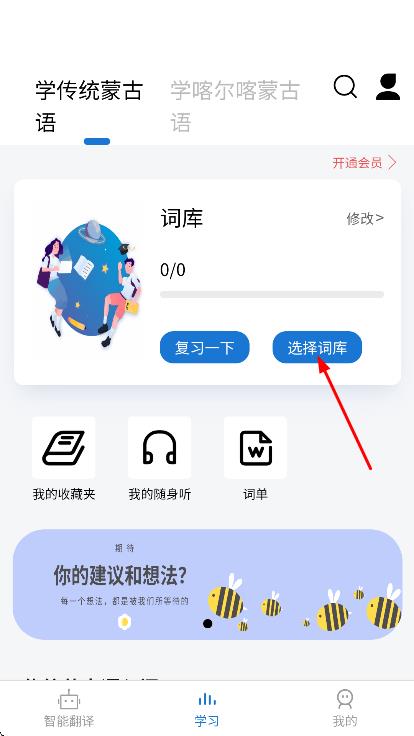 2、在学习页面,点击选择词库,进入词库选择界面。