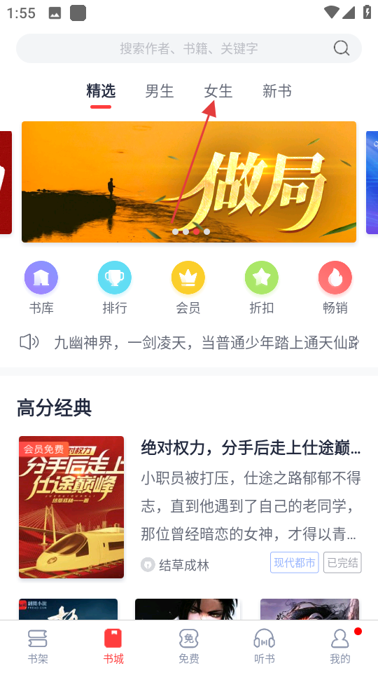 1、进入软件书城页面,点击女生分类,进入女生类书籍页面。