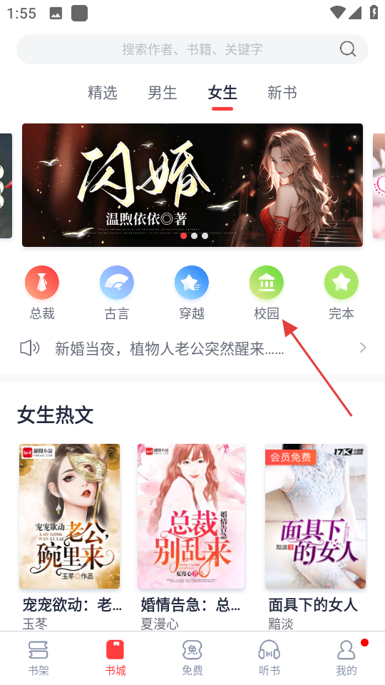 2、在女生类书籍页面,点击校园分类,进入青春校园类书籍页面。