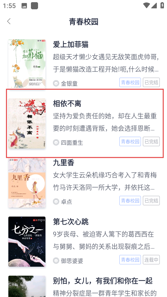 3、在青春校园类书籍列表中,挑选心仪的书籍,比如相依不离,点击进入书籍详情页。