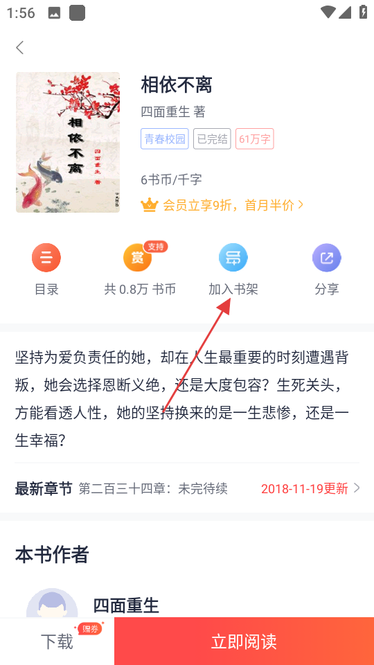 4、在书籍详情页,点击加入书架按钮,将书籍加入书架。