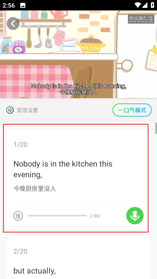 4、在配音页面,点击麦克风,根据屏幕显示的文字进行配音。