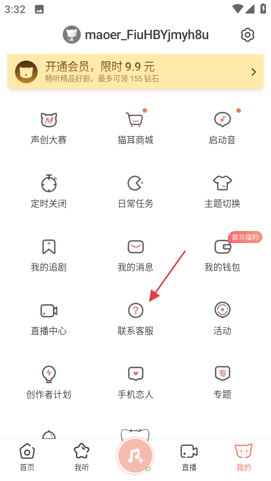 2、在个人中心页面,点击联系客服选项,进入客服中心页面。