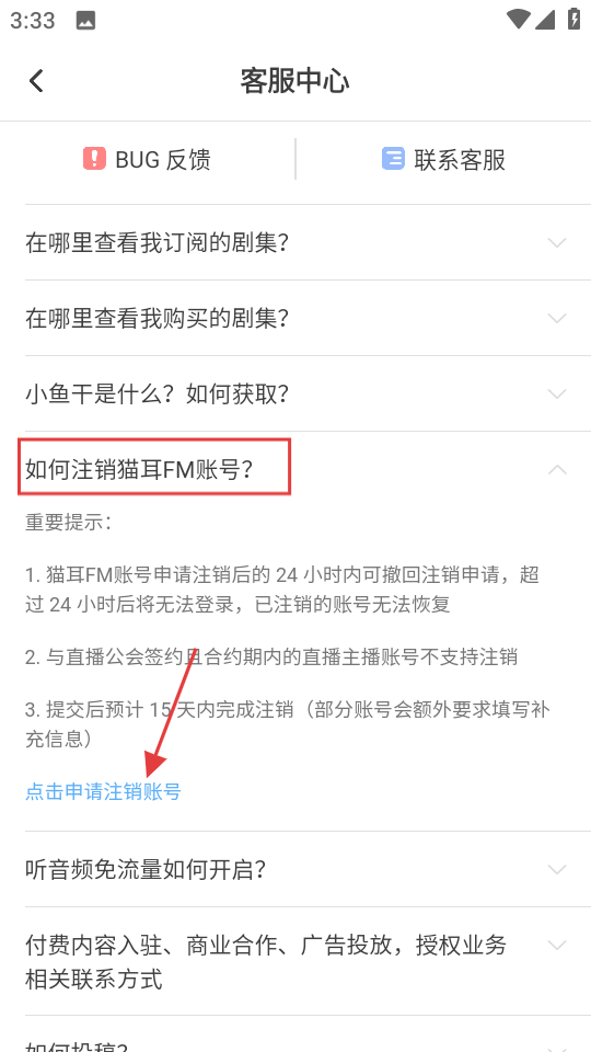 3、找到如何注销猫耳FM账号问题,点击点击申请注销账号,进入账号注销页面。