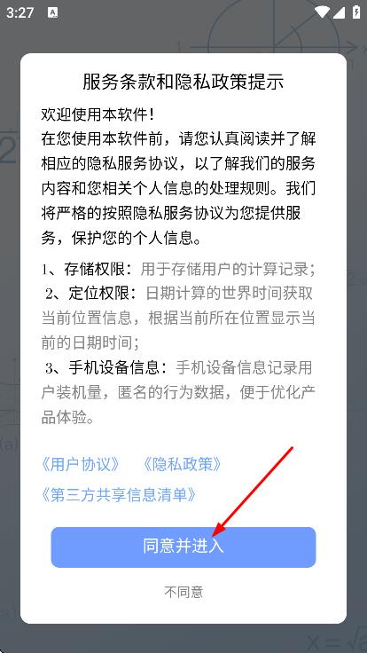 1、在服务条款和隐私政策提示弹窗中,点击同意并进入。