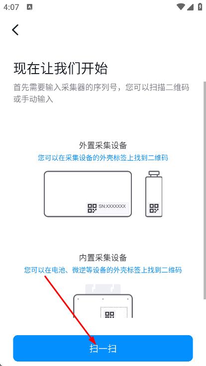 4、在扫码页面,可扫描设备上的二维码,添加设备。
