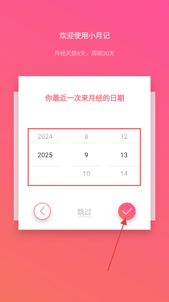 2、在日期选择页面,选择最近一次来月经的日期,点击确认按钮。