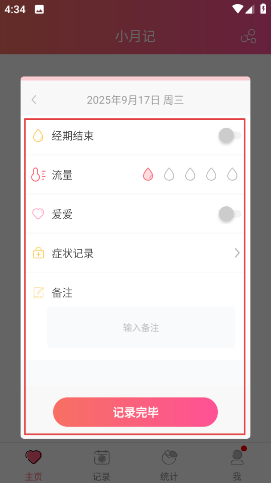 4、在记录详情页面,填写经期相关信息,点击记录完毕完成记录。