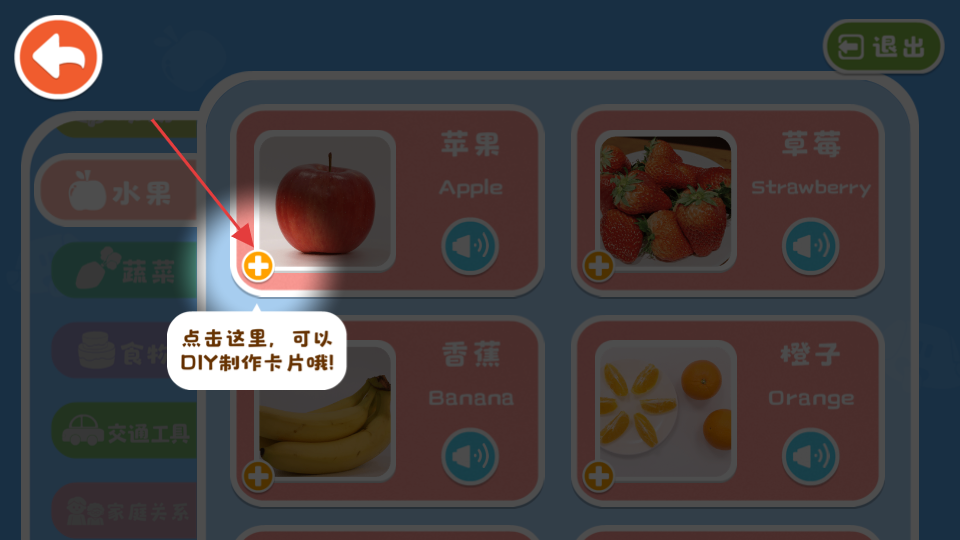 3、看到水果卡片旁的+号,点击它可以进行DIY制作卡片。